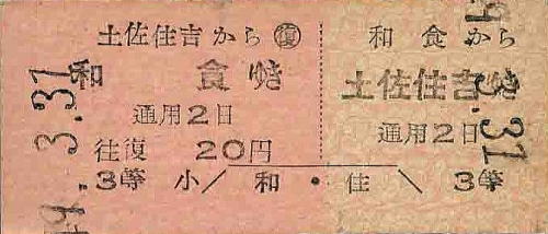 土佐電気鉄道 B型 往復乗車券 和食→土佐住吉→和食 20円 1974年/昭和49年3月31日 和食駅発行 |