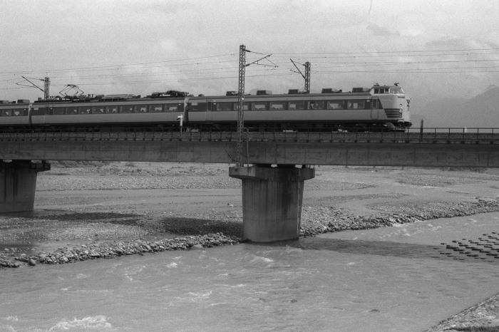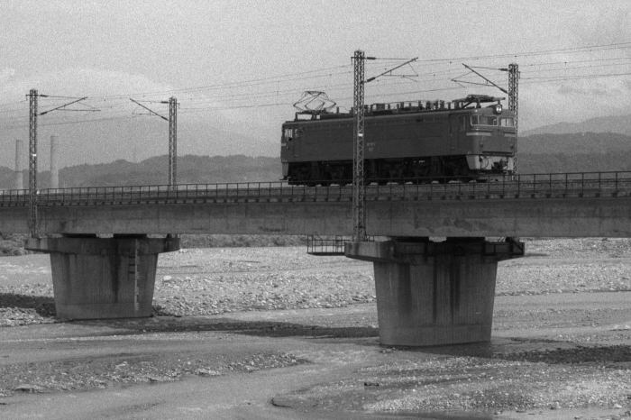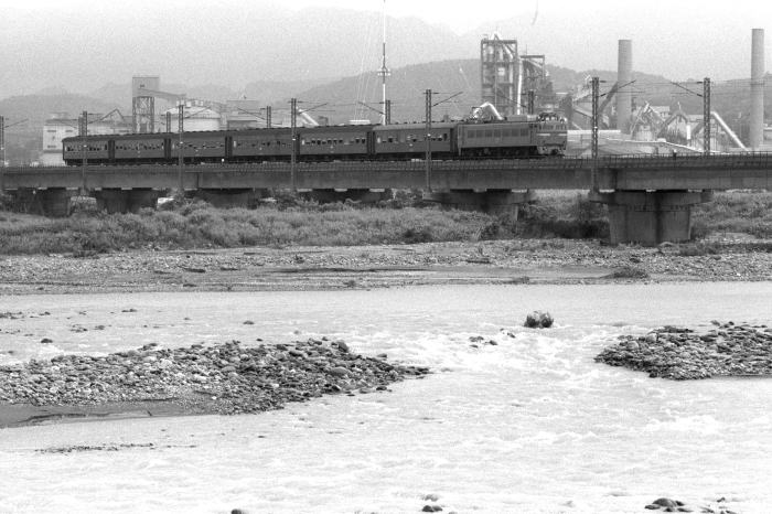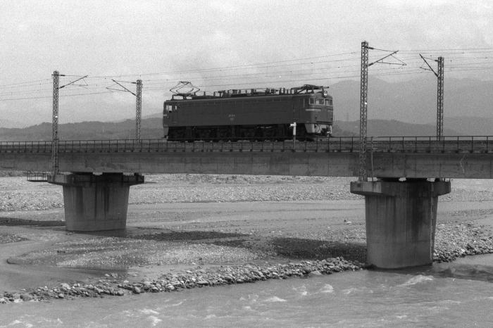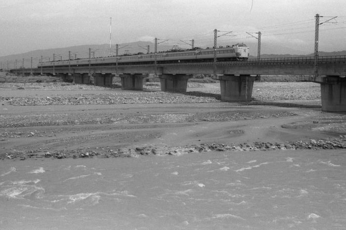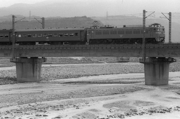 | 北陸本線の糸魚川-青海間の姫川橋梁で列車撮影しました。 当時,北陸本線の交流電化区間である富山-糸魚川間には, 昼行急行はなく,〔夜行急行は能登(上野-金沢),きたぐに(大阪-新潟)〕 485系特急: 白鳥(大阪・福井-青森),雷鳥(大阪-新潟),北越(金沢-新潟), 489系特急: 白山(上野-金沢) および 475系普通列車,EF81・EF70牽引普通客車列車が運転されていました。 |