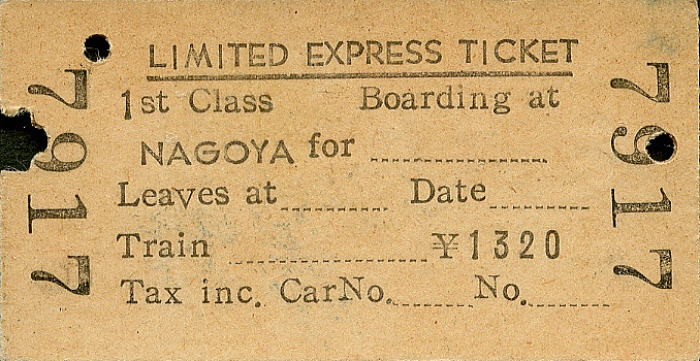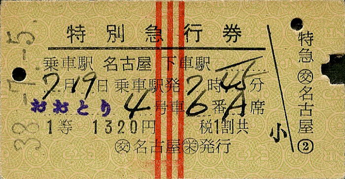 | 名古屋発東京行き特急おおとり 1等特別急行券 1963年/昭和38年7月5日 交通公社名古屋栄発行 | ||