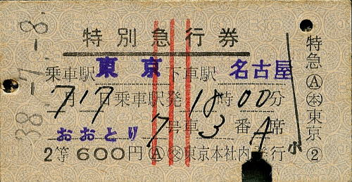 特急おおとり 特別急行券 7月17日乗車 東京1800→名古屋 2等 600円 1963年/昭和38年7月8日 交通公社東京本社内発行 |