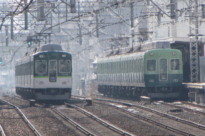 | 新標準色 1000系(1503)・旧標準色 2400系(2453) 2012.1.13 千林〔京阪電鉄 京阪本線〕 | ||