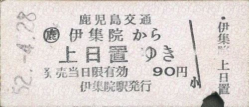 一般式乗車券B型 伊集院から上日置ゆき 90円 1977年/昭和52年4月28日 伊集院駅発行 |