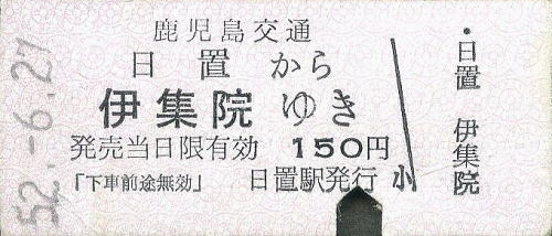 一般式乗車券B型 日置から伊集院ゆき 150円 1977年/昭和52年6月27日 日置駅発行 |