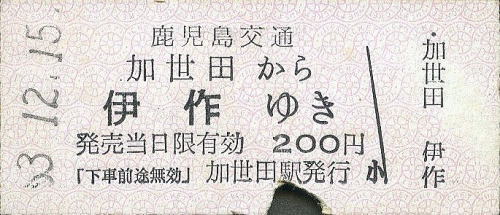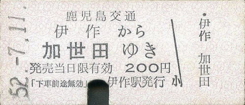 一般式乗車券B型 伊作から加世田ゆき 200円 1977年/昭和52年7月11日 伊作駅発行 |