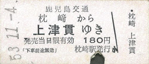一般式乗車券B型 枕崎から上津貫ゆき 180円 1978年/昭和53年11月4日 枕崎駅発行 |