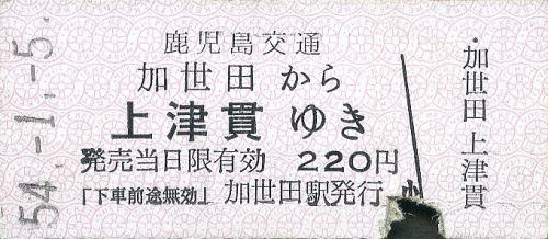 一般式乗車券B型 加世田から上津貫ゆき 220円 1979年/昭和54年1月5日 加世田駅発行 |