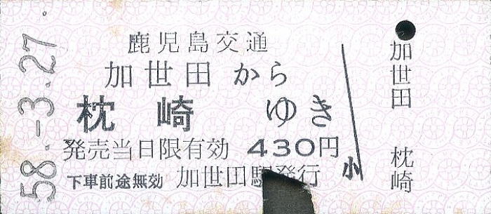 | 鹿児島交通/加世田から枕崎行き B型一般式乗車券 1983年/昭和58年3月27日 加世田駅発行 | ||