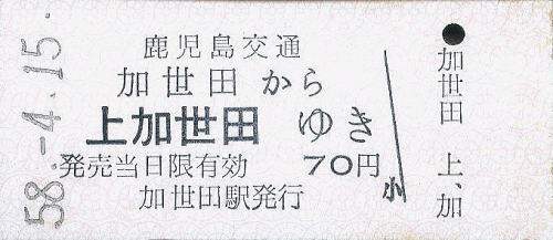 一般式乗車券B型 加世田から上加世田ゆき 70円 1983年/昭和58年4月15日 加世田駅発行 |