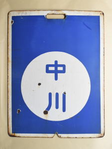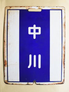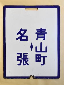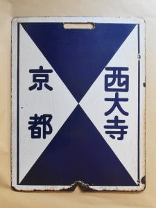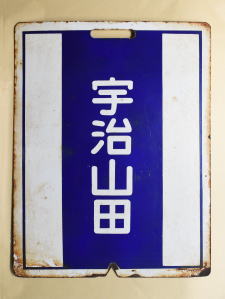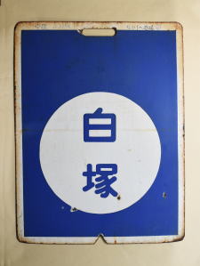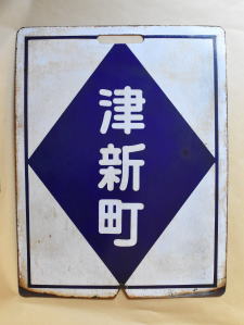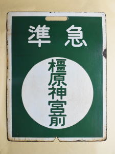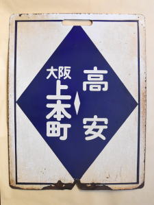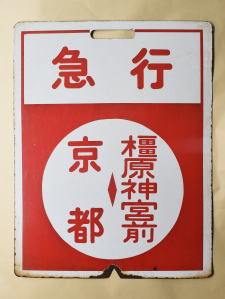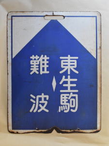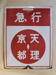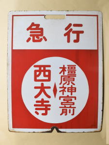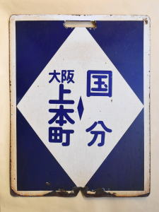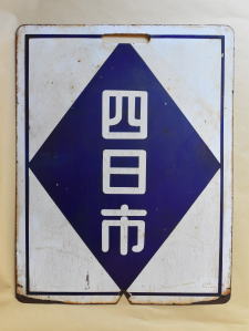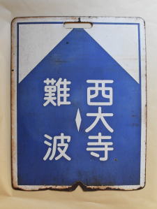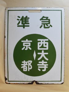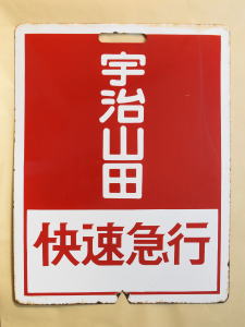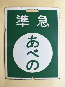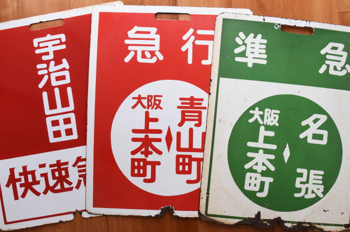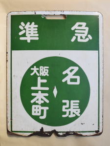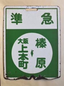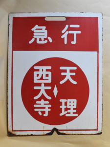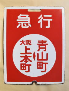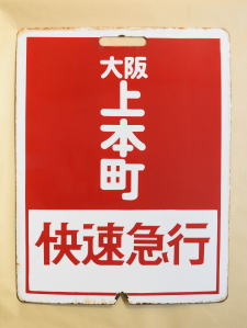 かつて,近鉄(近畿日本鉄道)電車の先頭部につけられた前頭行先板です。 急行・準急・普通など列車種別と行き先・区間を遠くから識別できるように 450×585mmの琺瑯鉄板に, 列車種別を色で区別して,行き先・区間をデザインしていました。 急行(快速急行・急行・区間急行)は赤と白, 準急は緑と白,赤と白も存在,普通は青と白で表示されていました。 1981年以降に製造のチョッパ省エネ車(1400系・8810系など)は, 先頭部の上部に幕式種別行先表示器を組込んだスタイルで登場, それ以前の車輌は,1984-92年の更新工事のときに 先頭部および側面部に幕式種別行先表示器を設置しました。 前頭行先板は特別な場合を除き,1990年代に廃止になりました。 |