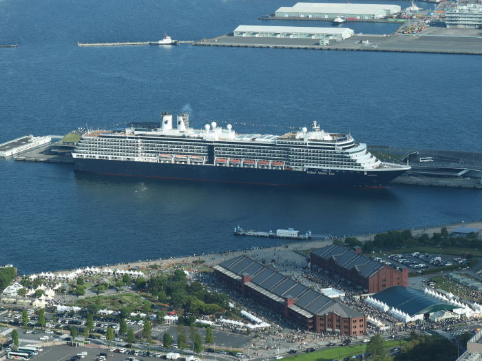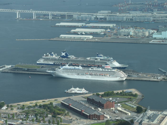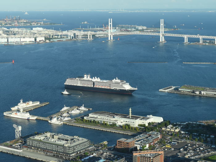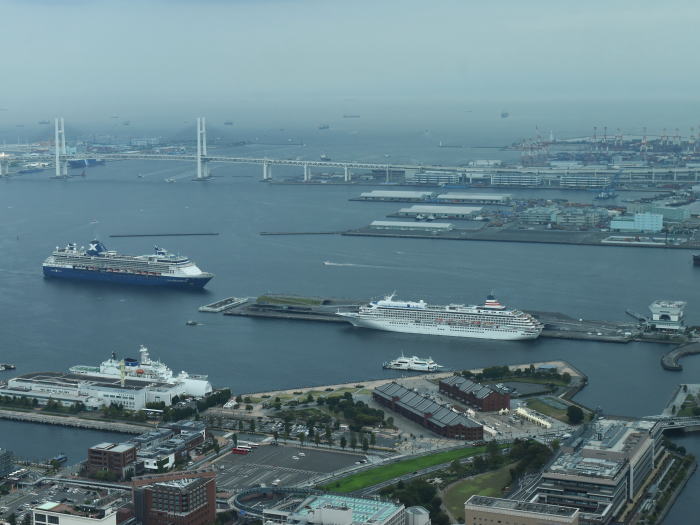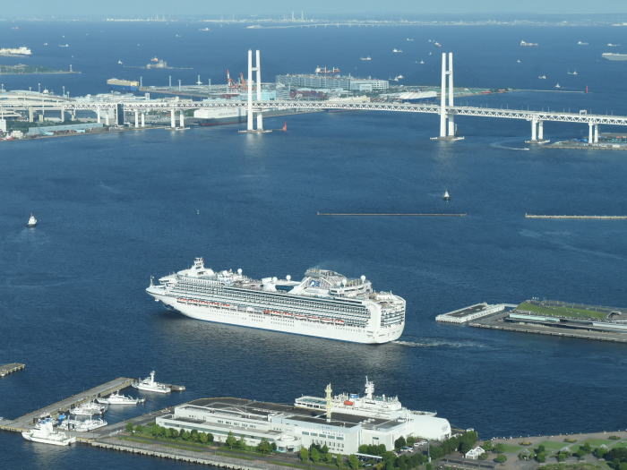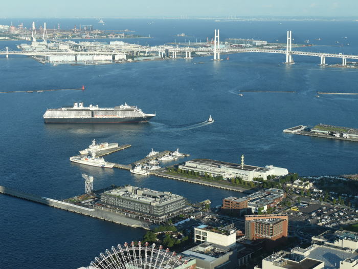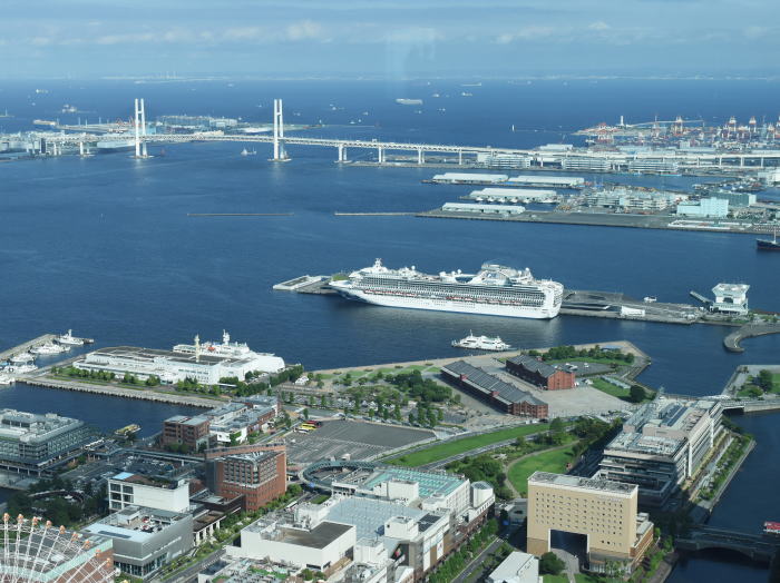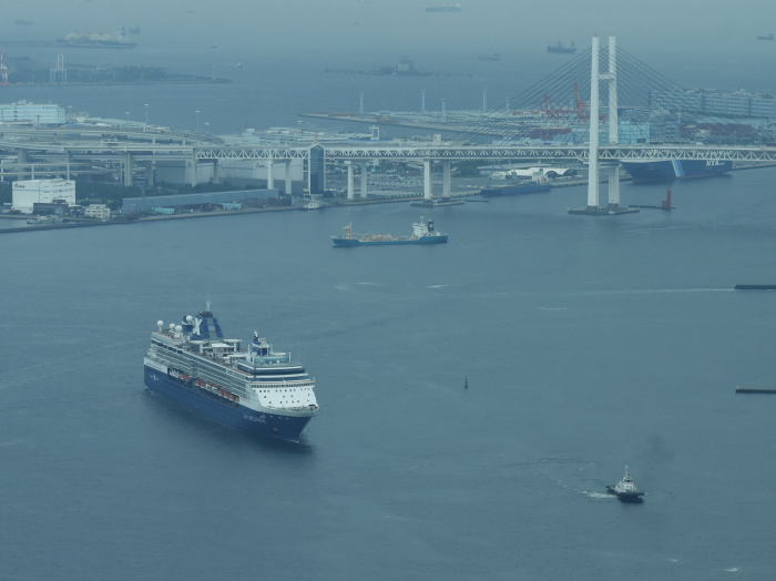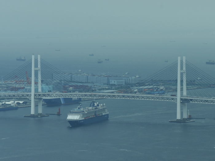 横浜ランドマークタワー・69階展望フロア/スカイガーデンから 客船の入港・出港シーンを撮影しています。 スカイガーデンからは, 横浜ベイブリッジを潜る客船,本牧沖を航行する客船も撮影できます。 天気の良い日は,富士山,東京スカイツリー,海ほたるなどを望めます。