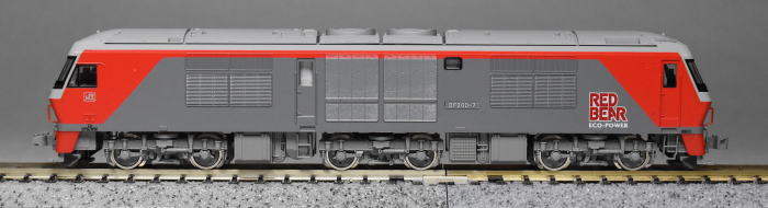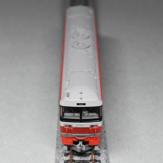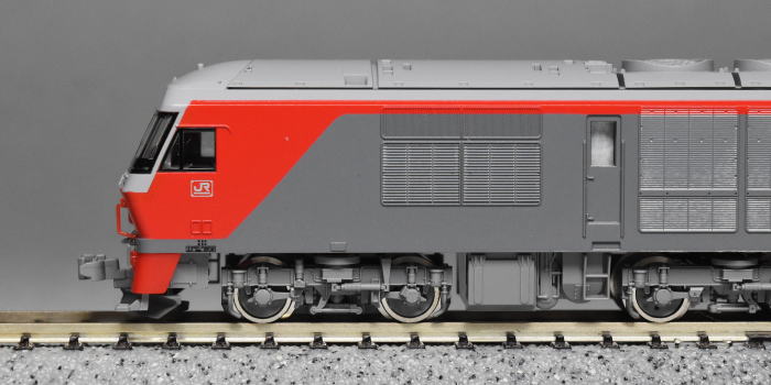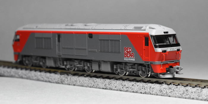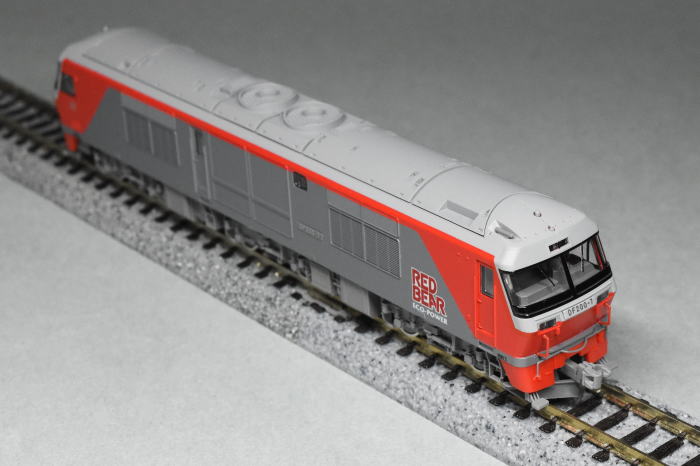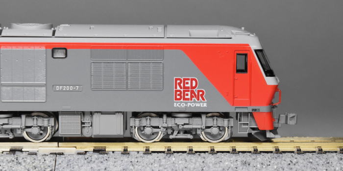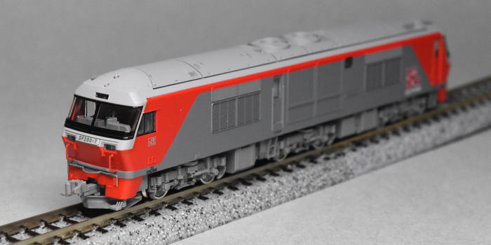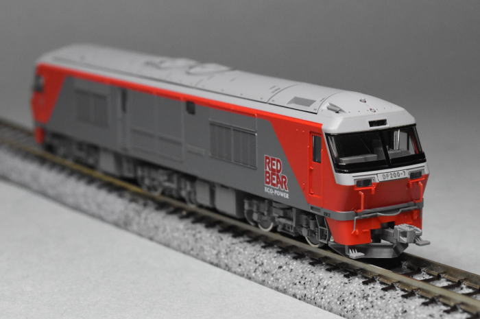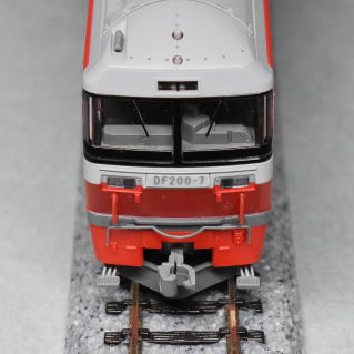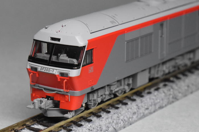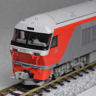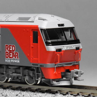TOMIX発売のDF200 0番台のNゲージ モデルです。 付属のナンバープレートを付けて,DF200-7に仕上げました。 DF200は,北海道において無煙化以降の貨物輸送を担っていた DD51の出力不足・老朽化に対応するため, JR貨物が開発した電気式ディーゼル機関車で1992年に試作車(900番台)が登場, 0番台が1994-98年に12輌製造され,全機が北海道に配置されました。 公募により,ECO-POWER RED BEAR の愛称が付けられ 車体側面にロゴが描かれています。 その後も,1999-2004年に50番台が13輌, 2005-11年に100番台が23輌,2016年から200番台が製造されています。 900番台,0番台はスカートを赤色に塗装されており, スカートが灰色の50番台,100番台,200番台と区別できます。 北海道の主力機関車は,D51からDD51,DF200に変遷しています。 |