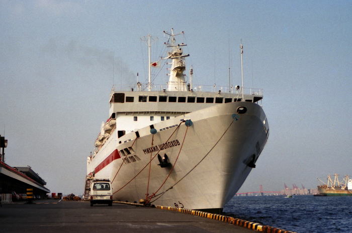 1987年/昭和62年,横浜大桟橋を出港するソ連カーフェリー客船 MIKHAIL SHOLOKHOVです。