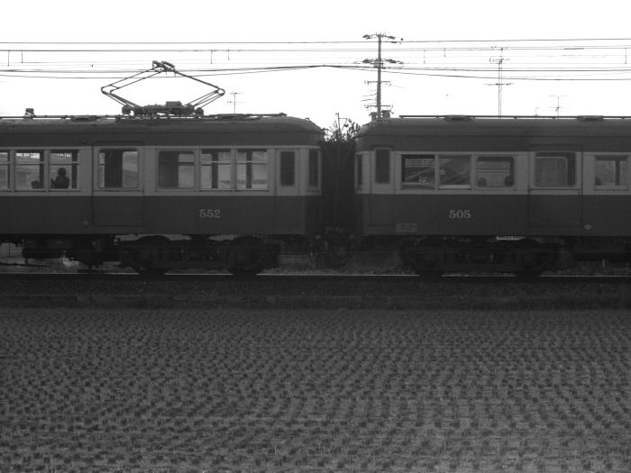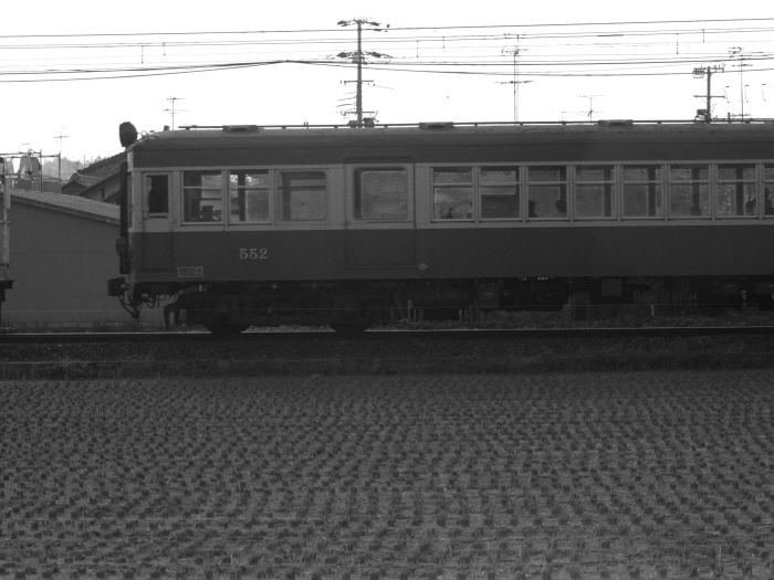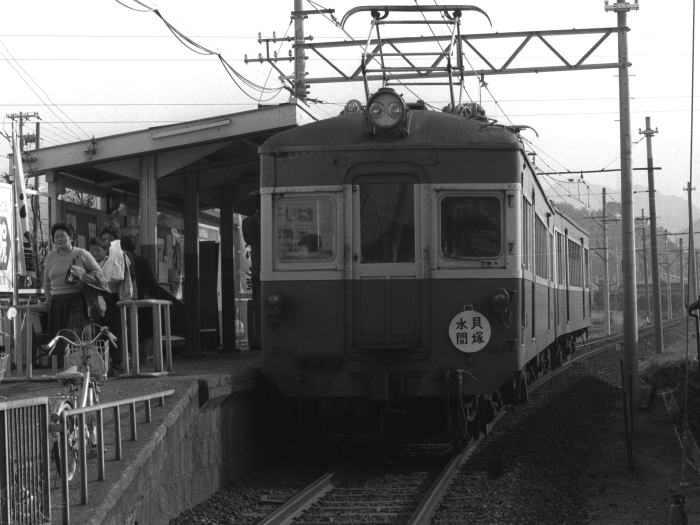 | 三ケ山口駅は,終着駅・水間駅の一つ手前の駅です。 当時,水間駅から歩いて撮影ポイントを探し, 三ケ山口駅,三ケ山口駅-三ツ松間で撮影しました。 苅田の開けたポイントで,501形のサイドビューを撮影しています。 三ケ山口駅は,片側ホーム1面1線の駅舎のない無人駅でした。 駅前には,多くの自転車がおいてありました。 |