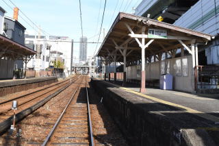 木津川駅は,高野鉄道が道頓堀(現 汐見橋)-大小路(現 堺東)延伸の 1900年/明治33年に開業しました。 島式ホーム1面2線,貨物用側線を配した構内で, 構内踏切を渡って,西側に駅舎があります。 木津川駅は,紀伊山地で伐採された材木などの貨物を 木津川航路に繋ぐため,貨物取扱いの側線が設けられました。 舗装されていない広場にレトロな木造駅舎がぽつんと建っています。 |