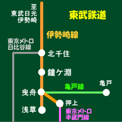 鐘ヶ淵駅は東武鉄道・伊勢崎線の途中駅です。 吾妻橋-北千住が開通した1902年/明治35年に開業しました。 駅周辺は,鐘淵紡績の操業地として繁栄しました。 相対ホーム2面4線(中央2線が通過線)の駅です。 1923年の荒川放水路開削工事のとき 経路変更になり現在の急カーブのある駅になりました。 日中は,浅草-北千住間のシャトル普通列車のみが停車, 特急スペーシア・スペーシアX・りょうもうなど優等列車, 東京メトロ/半蔵門線・東急/田園都市線直通列車は 中2線を通過します。 |