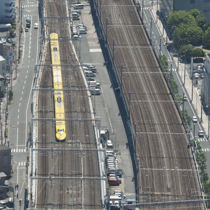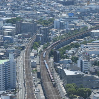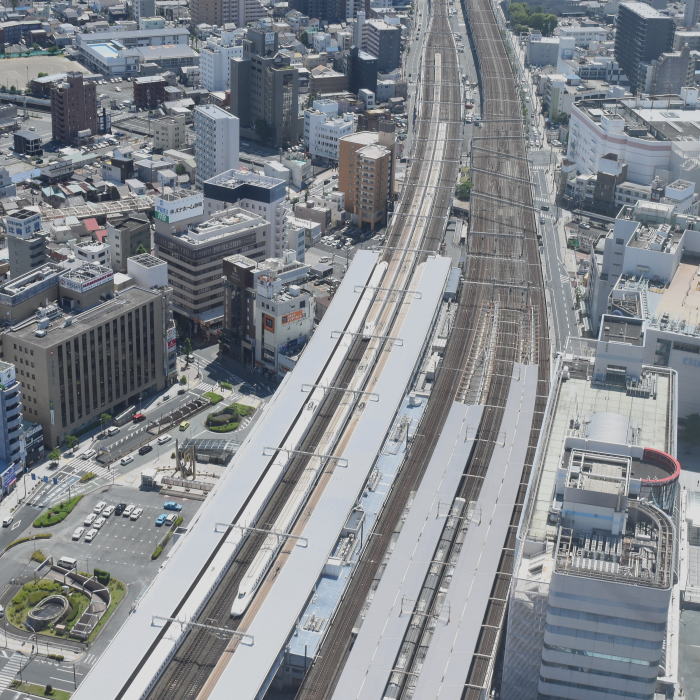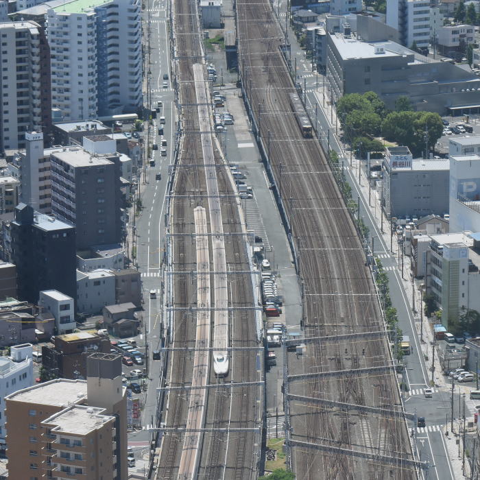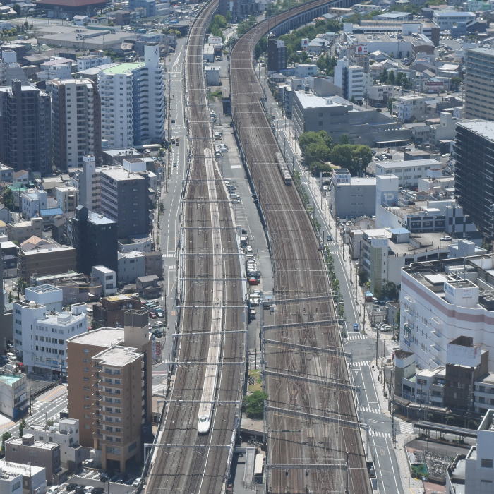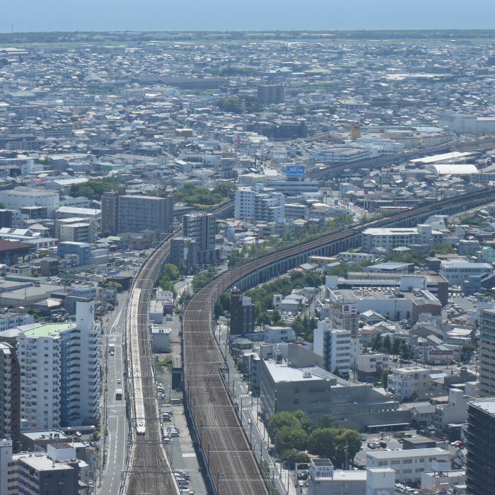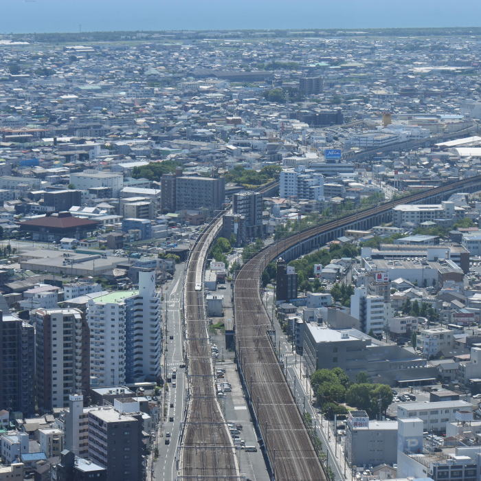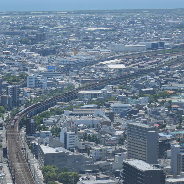 | 浜松上空 再び ◆浜松駅に隣接する浜松アクトタワーから 東海道新幹線,東海道線,遠州鉄道線を俯瞰撮影しました。 アクトタワーは地上45階の超高層ビルです。 最上階(地上185m)の展望フロアから 浜松駅西方の東海道新幹線・東海道本線,遠州鉄道・高架線を 遠く広く俯瞰できます。 9年前の2016年2月25日にも アクトタワーから俯瞰撮影しました。 2016浜松空中散歩 当時は東方向(掛川方向)も撮影しましたが, 現在はフロアの東半分にチャペルが設けられため撮影不能です。 |