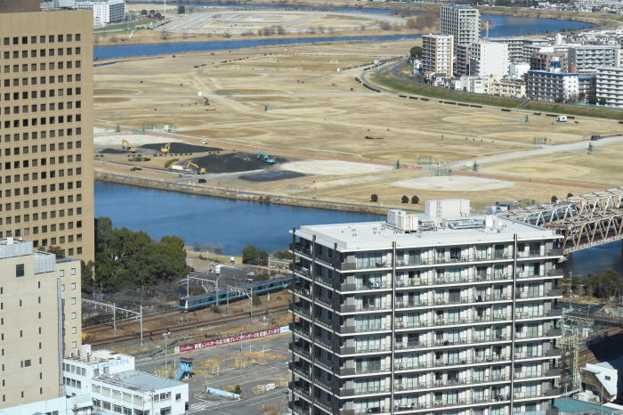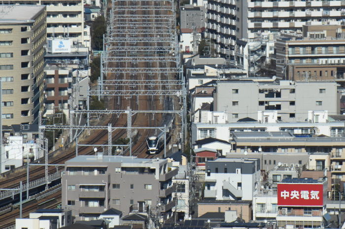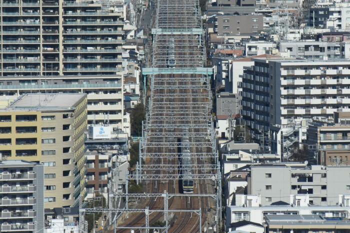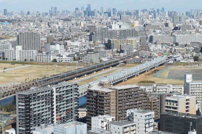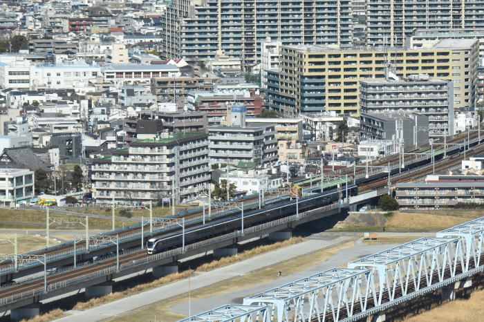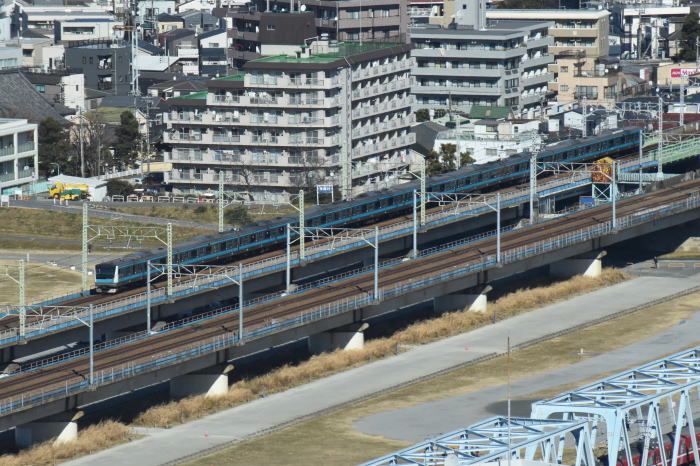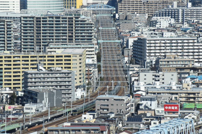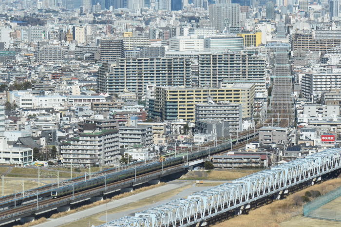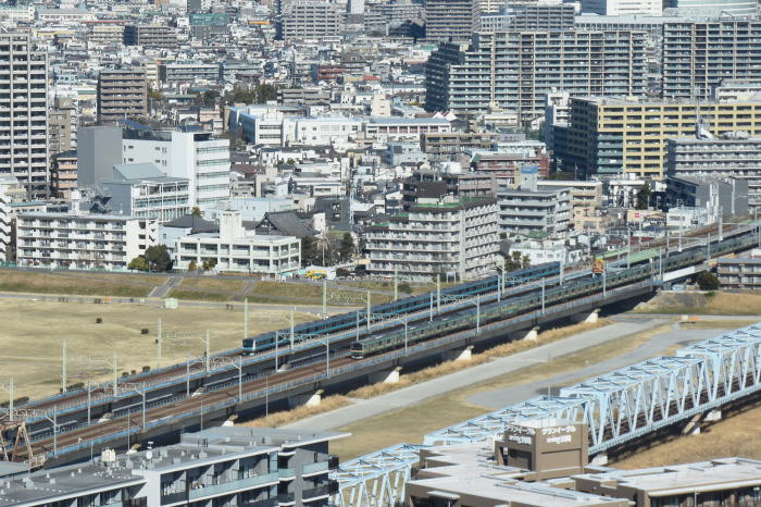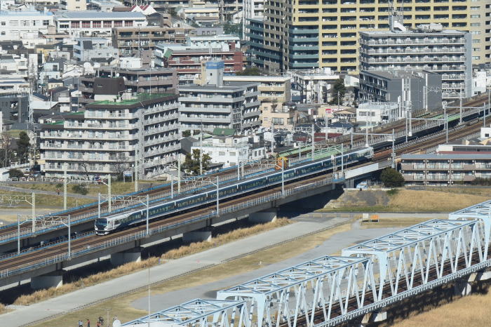| 多摩川上空 ◆川崎市役所の25階・展望ロビー・スカイデッキから JR東海道線の多摩川(六郷川)橋梁から 蒲田方向に続く線路を俯瞰しました。 多摩川(六郷川)橋梁では, トラス橋部に続くコンクリート橋部を走る 列車全景を撮影できます。 東海道線のE231系・E233系, E257系踊り子,E261系サフィール踊り子, 京浜東北線のE233系1000番台を撮影 |