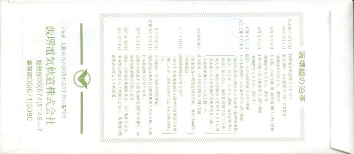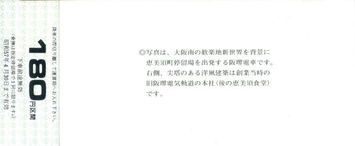 阪堺電気軌道が1982年/昭和57年4月1日に発行した阪堺線開通70周年記念乗車券です。 阪堺線は,阪堺電気軌道/上町線とともに大阪の路面電車として現在も運行しています。 阪堺線は,大阪市内の恵美須町から堺市の浜寺駅前を結ぶ14kmの軌道線(路面電車)です。 1911年/明治44年に阪堺電気軌道が恵美須町-市ノ町(現 大小路)を開業, 翌1912年/明治45年に市ノ町(現 大小路)-浜寺の開業により阪堺線が開通しました。 阪堺線を運行する阪堺電気軌道は1915年/大正4年に南海鉄道に統合, 南海鉄道は1944年/昭和19年に戦時統合により関西急行鉄道と合併して近畿日本鉄道になりましたが, 戦後1947年/昭和22年に,阪堺線を含む元南海鉄道線は南海電気鉄道として分離しました。 南海電気鉄道の軌道線である上町線と阪堺線は, 1980年/昭和55年に2代目・阪堺電気軌道として分離,現在に至ります。 この記念乗車券は,1912年の阪堺線の開通から70周年を迎えた1982年に発行されました。 |