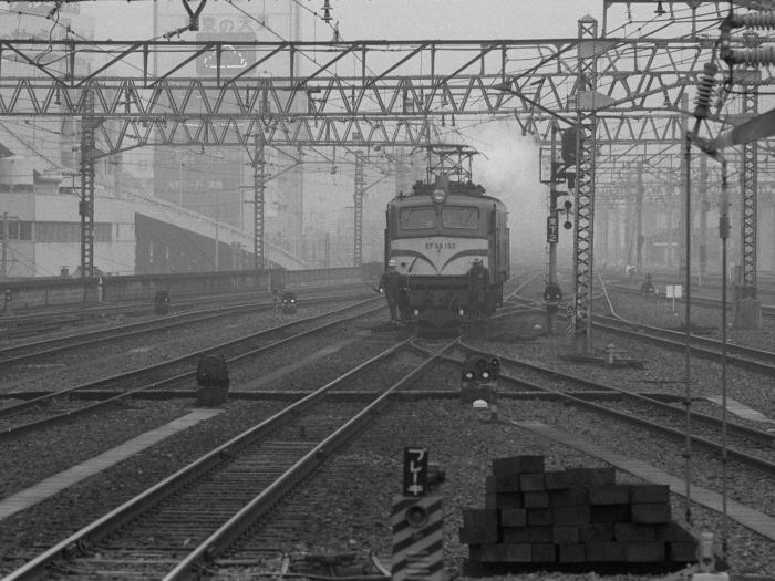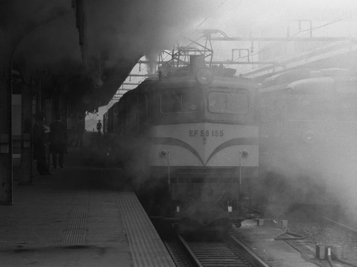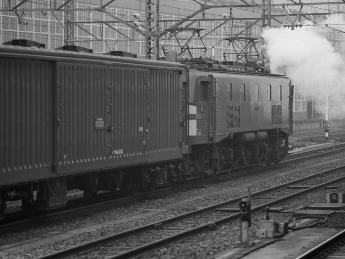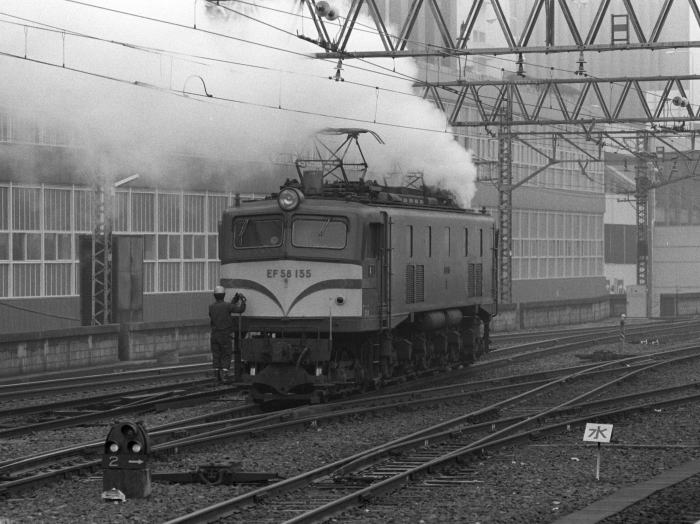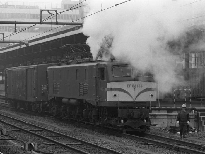 | 当時,EF58は東海道・山陽本線の荷物列車運用に活躍していましたが, 2年後の1984年3月,EF62に置換えられ撤退しました。 東海道山陽本線の荷物列車のけん引機関車には, 旧型客車/荷物車のため,暖房用蒸気発生ボイラ搭載のEF58が運用されていました。 冬期のEF58の入換作業では,余剰の蒸気を噴き上げていました。 この日は,EF58 125とEF58 155が入換作業する姿を撮影しました。 |