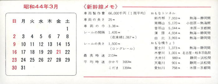 1969年/昭和44年3月1日発行の国鉄/東海道新幹線・2億人乗車記念券です。 東海道新幹線は,1964年/昭和39年10月1日に開業しました。 開業当時は,1-1ダイヤ(1時間にひかり1本・こだま1本運行)・0系12輌編成・最高速度200km/h, 東京-新大阪間を ひかり4時間・こだま5時間で運行されました。 翌年11月1日に2-2ダイヤ,東京-新大阪間を ひかり3時間10分・こだま4時間にスピードアップされました。 1967年には3-3ダイヤに増発され,ひかり・こだまは20分間隔・毎時6本の運転になりました。 さらに,翌年に大阪万国博覧会を控えた1969年10月1日に,多客期にこだまを増発する3-3(変則3-6)ダイヤになり 12月8日からは ひかり16輌編成の運転が始まりました。 開業から輸送力を増強した結果, 開業1016日目の1967年/昭和42年7月13日に1億人乗車, 開業1613日目の1969年/昭和44年3月1日に2億人乗車を達成しました。 3億人乗車達成は,大阪万国博覧会開催中の開業2101日目の1970年/昭和45年7月2日でした。 4億人乗車は1971年/昭和46年9月7日,5億人乗車は1972年/昭和47年9月23日になり 東海道新幹線の乗客数は,年間約1億人を超えていきました。 東海道新幹線は開業以来68億人(2023年現在)を輸送,2023年の年間乗客数は1億6000万人でした。 |