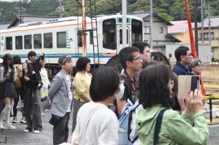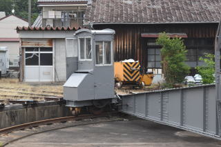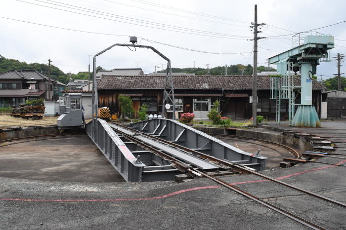 天竜二俣駅の東側に運転区(車両基地)があります。 前身の遠江二俣機関区は二俣線の蒸気機関車の基地であり 晩年はC58が配置されましたが,1971年に無煙化されています。 蒸気機関車時代の転車台と扇形車庫が現在も継続使用されており 当時のローカル線の機関区の全てを観ることができます。 木造の扇形車庫や事務所は, 映画「シン・エヴァンゲリオン劇場版」の撮影現場に使用されました。 運転区の見学ツアーに参加して 登録有形文化財に指定の転車台,扇形車庫,高架貯水槽,事務室などを 係員に引率されて約40分間,見学しました。 転車台では気動車を載せた転回の実演がありました。 |