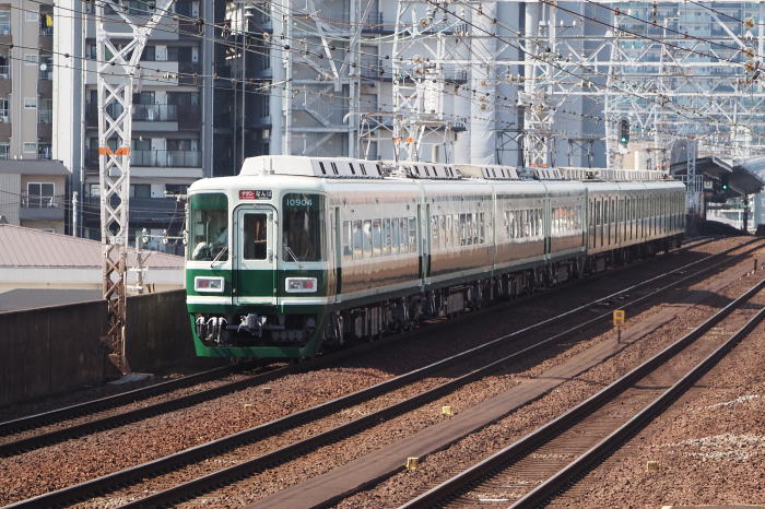 南海電鉄は創業140周年を記念して,2025年6月4日から 特急「サザン」用10000系・10004F(4輌編成)を 旧標準色(濃淡グリーンのツートンカラー)に復元して運行を開始しました。 10000系は創業100周年にあたる1985年から 特急「サザン」10000系(4輌)+7000系/7100系(4輌)の運行を始めました。 当時は,濃淡グリーンのツートンカラーでしたが, 1992年に現在のブルーとオレンジのラインカラーに変更になりました。 2024年8月21日から,7100系運行開始55周年を記念して 7100系・7169F(4輌編成)が濃淡グリーンのツートンカラーに復元されており 今回復元の10000系と連結して, 旧標準色の特急「サザン」10000系+7100系を再現して運行されています。 旧標準色の特急「サザン」の復元は, 2015年6月13日~9月30日にも,創業130周年と7000系引退を記念して 旧標準色の特急「サザン」10000系+7000系が運転されました。 Again! 南海電鉄 10000系 登場時旧標準色 |