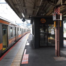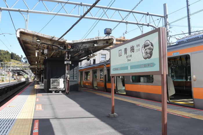 青梅駅はJR東日本・青梅線の中間駅です。 1894年/明治27年の青梅鉄道(立川-青梅)開通時に開業。 駅舎は1924年/大正13年に青梅鉄道本社ビルとして 鉄筋コンクリート造り3階建てに改築されました。 1944年に国有化され青梅線の駅になりました。 島式ホーム2面3線の地上駅で構内に側線が多くあります。 青梅-立川間,青梅-東京間の列車が頻繁に発着します。 東京・立川と奥多摩の直通列車はなく乗換えが必要です。 青梅駅はレトロステーションとして 駅名標やホーム,地下通路に昭和レトロ装飾しています。 |