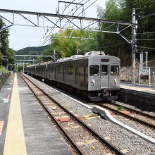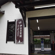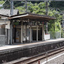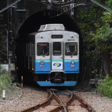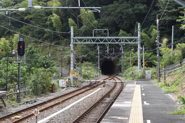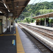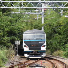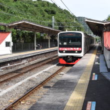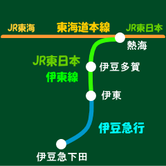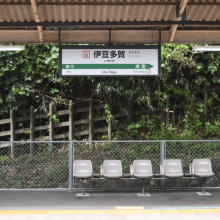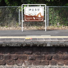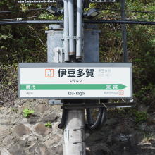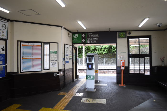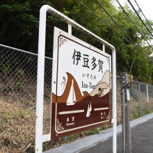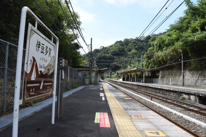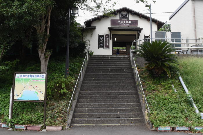 伊豆多賀駅はJR東日本・伊東線(熱海-伊東)の中間駅です。 1935年/昭和10年の熱海-網代開通時に開業しました。 相対式ホーム2面2線の地上駅, 上りホームと下りホームは地下通路で結ばれています。 伊東線はJR東日本と伊豆急行が相互直通運転しており 朝夕夜を除き日中は, JR東日本の特急踊り子と伊豆急行の普通列車が走ります。 Suica利用が可能な無人駅で, 高台にある木造駅舎の改札口から海が望めます。 11輌編成が停車可能なホームが山の斜面に真っすぐに伸び, 緑の中を走る列車を撮影することができました。 |