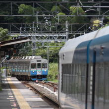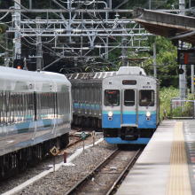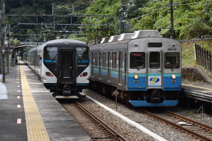 | 単線のため交換するE257系2000番台/下り特急踊り子と8000系/上り普通列車 | ||