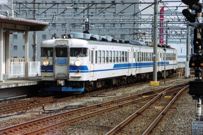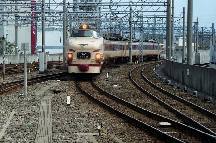 1999年/平成11年9月26日,出張の途中に金沢駅を発着する列車を撮影しました。 当時の金沢駅には,大阪・名古屋・米原・新潟・越後湯沢を結ぶ 485系,681系特急が頻繁に発着していました。 大阪へは485系“雷鳥” 11往復,485系“スーパー雷鳥” 4往復, 681系“サンダーバード” 8往復が運転され, 名古屋とは485系“しらさぎ”,米原とは485系“加越”,新潟とは485系“北越”, 上越新幹線に接続する越後湯沢とは485系・681系“はくたか”が結びました。 これらの特急の合間に,419系・475系普通“TOWNトレイン”が運転されていました。 |