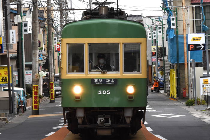 | 前照灯を腰部2灯・角型尾灯に改造した300形(305) 2020.2.20 江ノ島-腰越 | |
