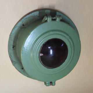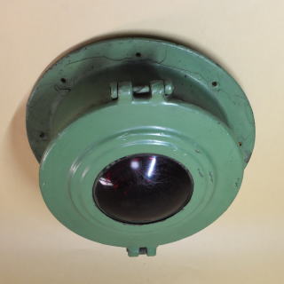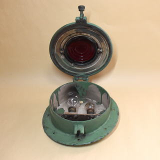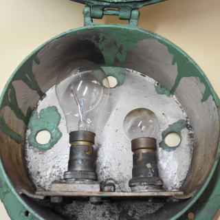 江ノ島電鉄 300形の電燈式尾灯です。 直径275mm・鋳鉄製・電球は110V 60Wと110V 10Wの2球 300形は1956-68年/昭和31-43年に 自社・都電・西武・京王の電車を種車に2輌連接構造に改造した電車です。 2編成×6本 (301-306)・12輌が導入されました。 種車と改造手法がまちまちであったことから 302・303編成を除く4編成は形態・仕様が異なっていました。 300形は繰り返し改造を受け 前照灯を腰部2灯化したとき,尾灯も更新されました。 1976年/昭和51年に江ノ島駅で この尾灯と同型の尾灯を付けた302編成を撮影しています。 302編成は1998年に引退,山梨のキャンプ場バンガローに利用されました。 現在2026年,冷房装置搭載など近代化改造が実施された305編成のみが 最古参の電車として活躍しています。 |