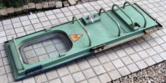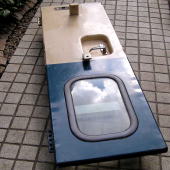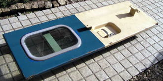 | 貫通扉の内側には, 屋根に上がる梯子になる手摺りが 取付けられています。 窓部の手摺りは, 取り外して, 扉の下部に収納できるようになっています。 |