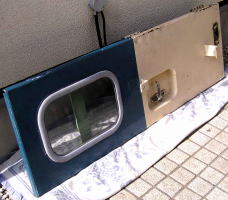 この貫通扉は, 一人では持てない重さと 高さ 168cm,幅 55cmの大きさがあり 家の中に置くのは,危ないため 現在は,外壁に立掛けてあります。 |