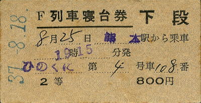 ●急行“ひのくに” 列車寝台券 F列車寝台券 下段 8月25日 熊本駅から乗車 19時15分発 ひのくに 第4号車 108番 2等 800円 昭和37年8月18日発行 |