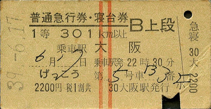 この切符は,1964年/昭和39年6月17日,大阪22時30分発,東京行寝台急行“月光”の普通急行券・寝台券です。 “月光”は,東京-大阪を結ぶ寝台急行でした。 この列車寝台券は,5号車・1等(現在のA寝台)寝台車の上段ベッド3番を指定しています。 1963年/昭和38年,電車急行“第2なにわ” が寝台急行“すばる”になり,東京-大阪・神戸間の寝台急行は, “銀河”,“明星”,“彗星”,“月光”,“金星”,“あかつき”,“すばる” の7往復になりました。 翌年1964年/昭和39年の東海道新幹線開業までの頃が,東海道本線・寝台急行の全盛時代です。 この切符は,東海道本線・寝台急行の全盛時代に走った“月光”のものです。 1964年/昭和39年の東海道新幹線開業で,“彗星”,“あかつき”,“すばる” が廃止になりました。 さらに,1965年/昭和40年,新幹線の増発により,“月光”,“金星” が廃止になりました。 1968年/昭和43年には,“明星” が “銀河” に統合され,“銀河” 2往復になりました。 “銀河” は,最後の東海道本線・寝台急行として頑張りましたが, 2008年/平成20年に廃止になり,東海道本線から寝台急行は消滅しました。 ほかの線区でも,新幹線・航空機・高速バスの拡充により,寝台列車は縮小されました。 この3月,日本海縦貫線の寝台急行電車“きたぐに”が,ブルートレイン“日本海”とともに廃止になります。 |