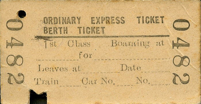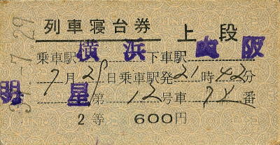 ●急行“明星” 列車寝台券 列車寝台券 上段 乗車駅 横浜 下車駅 大阪 7月29日 乗車駅発21時42分 明星 第12号車 72番 2等 600円 昭和39年7月29日発行 |