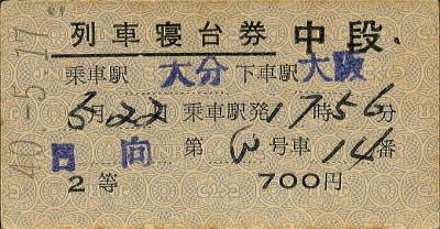 ●急行“日向” 列車寝台券 列車寝台券 中段 乗車駅 大分 下車駅 大阪 5月22日 乗車駅発17時56分 日向 第3号車 14番 2等 700円 昭和40年5月17日発行 |