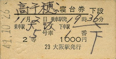 ●急行“高千穂” 列車寝台券 高千穂寝台券 下段 11月2日 乗車駅発19時36分 乗車駅 大阪 下車駅 5号車 1番 2等 1000円 23 大阪駅発行 昭和41年10月26日発行 |