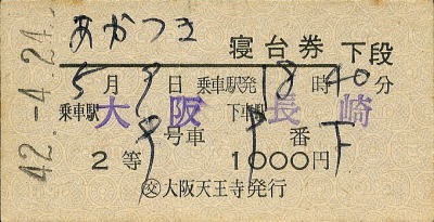 ●特急“あかつき” 列車寝台券 あかつき寝台券 下段 5月9日 乗車駅発18時40分 乗車駅 大阪 下車駅 長崎 9号車 9番 2等 1000円 23 大阪駅発行 交大阪天王寺発行 昭和42年4月24日発行 |