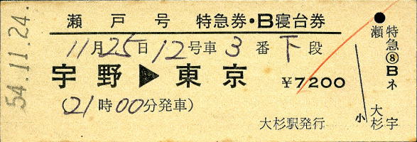 ●特急“瀬戸号” 特急券 B寝台券 11月25日 12号車3番 下段 宇野 ⇒ 東京 ¥7200 21時00分発車 大杉駅発行 昭和54年 11月24日発行 |