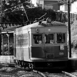 トロリーポールは, 1975年/昭和50年に, 京都市電から放出の Z型パンタグラフに改装されました。 乗務員は,折り返し時などの際に ポール操作をしていましたが, パンタグラフ化により不要になり ワンマン運転が可能になりました。 |