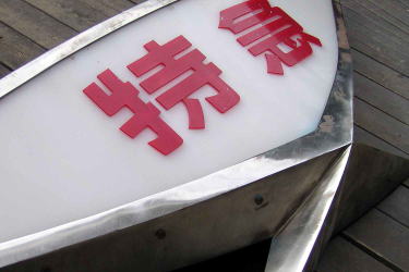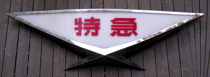 特急マークは,着脱式で,裏面には, 車体と結合するジグが装備されています。 特急マークは, 鋼製枠,プラスチック表示部と ステンレス製飾りから構成されています。 文字は,プラスチック切文字が 貼付けられています。 特急マークの内部に装備された 蛍光灯の照明により 文字が浮き立つようになっています。 特急マークは, 大きく,重く,車輌への取付けは, かなりの労力が必要であったと思います。 |