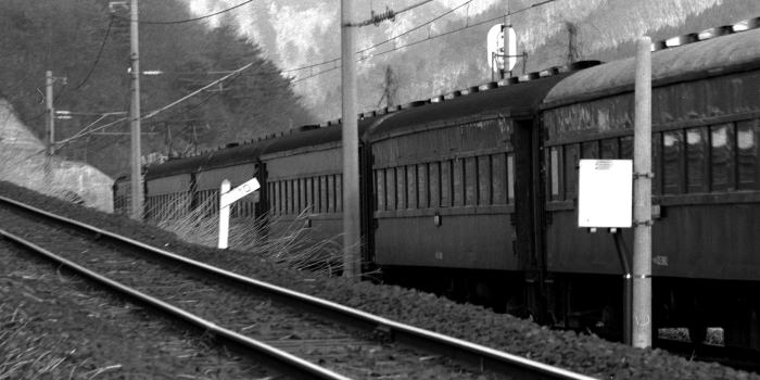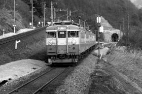 | ●側線に入線したED77牽引の普通列車は,ゆっくりと後退を始めました。 | |