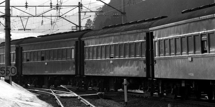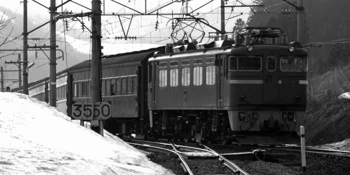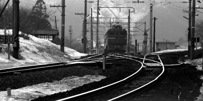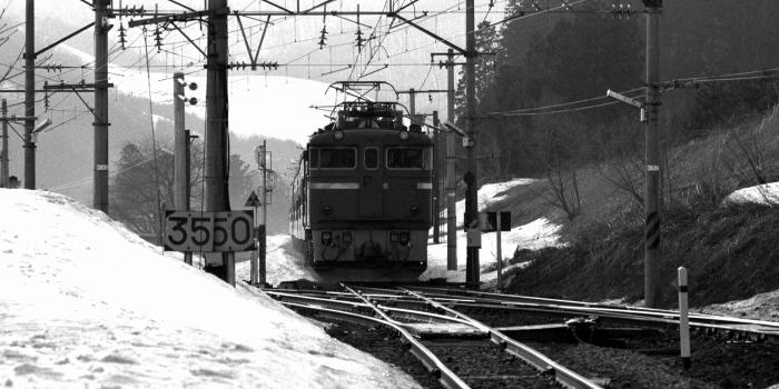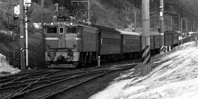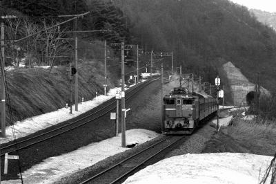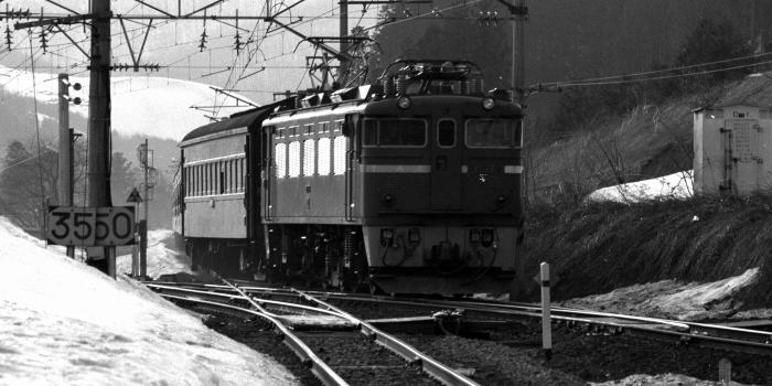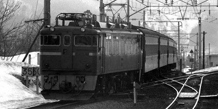 | ●ED77牽引の普通列車は,側線の下に延びる本線を郡山方面に降りていきました。 |