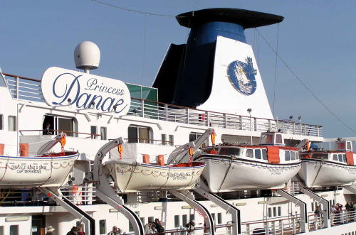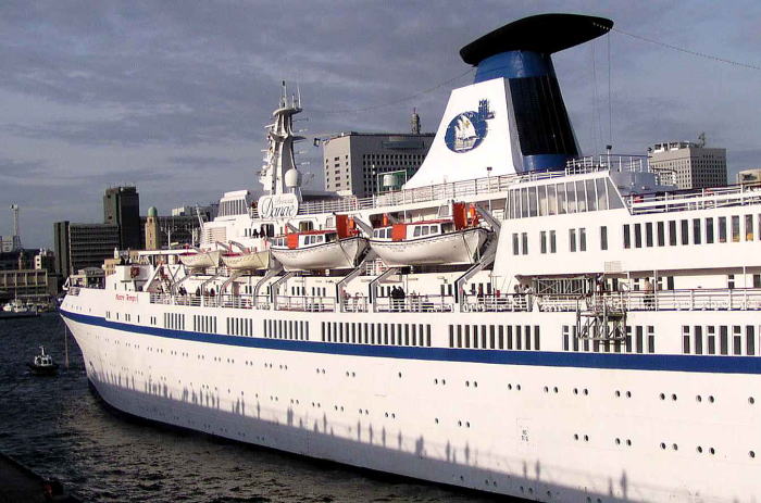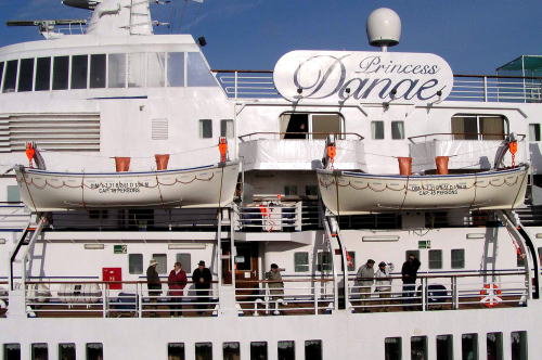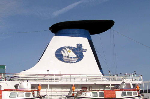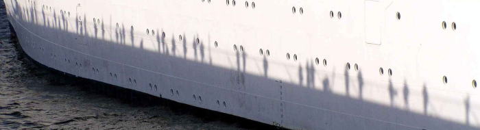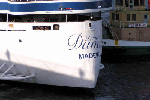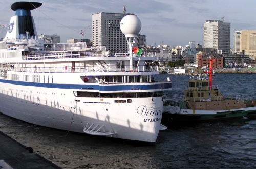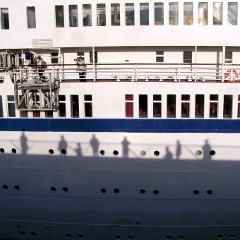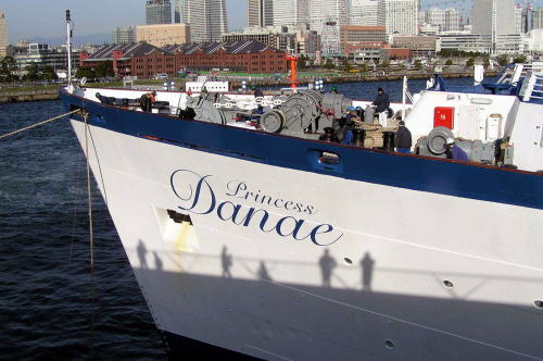●朝日が,出迎えの人々を船体に焼き付けていました。