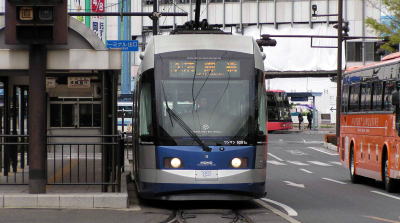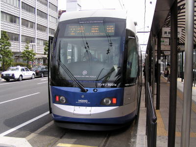 岡山電気軌道の最新の超低床電車“MOMO”です。