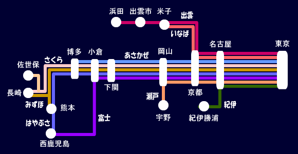 | 米子 | 紀伊勝浦 | 浜田 | 宇野 | 下関 | 博多 | 西鹿児島 | 西鹿児島 | 熊本 | 佐世保 | |