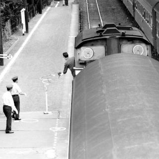 単線区間では,列車の正面衝突や追突を防止のため, タブレットを使って,列車を運行していました。 タブレットは,特定形の穴が開いた真鍮円盤です。 タブレットを皮革キャリアに入れて, 車輌(運転員)と駅(駅員)の間で,授受しました。 通過列車のタブレット授受は,迫力がありました。 左の写真は, 寝台特急“出雲”のタブレット交換シーンです。 これまでの区間のタブレットを駅に返すところです。 このタブレットは,停車中の普通列車に渡されます。 “出雲”は,この先(ホームの端)で, 普通列車が返したタブレットを受取って, 次の区間に進んでいきます。 現在は,殆んどの線区が自動化され, タブレットの授受は珍しくなりました。 |
