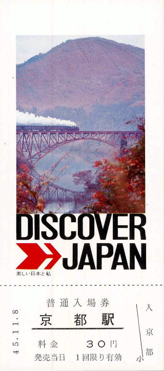 | 1970年/昭和45年の大阪万国博覧会が終了した10月から,当時の国鉄は,個人旅行を拡大するため, “DISCOVER JAPAN” キャンペーンを,全国で始めました。 キャンペーンは,個人客,とくに女性客をターゲットにして, 「日本を発見し,自分自身を再発見する」 をコンセプトで進められました。 日本全国を旅して,各地の名所紹介や住民とのふれあいをテーマに, 永六輔が “遠くへ行きたい” を主題歌にした紀行番組 “遠くへ行きたい” が始まったのも,このときです。 駅には,「美しい日本と私」 をテーマにしたイメージ・ポスターが貼られました。 “DISCOVER JAPAN” の記念切符が発売され, 特定観光地にしか設置されていなかった駅スタンプの設置駅が大幅に増えました。 その後の国鉄のキャンペーンは, 1978年/昭和53年に,山口百恵が歌う “いい日旅立ち” をキャンペーンソングとする “いい日旅立ち” , 1980年/昭和55年に,国鉄全線完乗を目指す “いい旅チャレンジ20,000km” へと続きました。 |